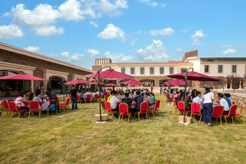 參觀山莊的過程中,與會(huì)嘉賓著重參觀了釀酒廠及酒窖。九頂莊園出產(chǎn)的所有葡萄酒均采用法國傳統(tǒng)工藝,輔以最新現(xiàn)代技術(shù)釀造而成。隨山勢(shì)自然傾斜而建的釀酒廠,能夠在采摘過程中保持葡萄果實(shí)的最佳品質(zhì)。酒廠建于山石之中,于山頂接收果實(shí),并讓其自然落入下方的發(fā)酵室內(nèi)。