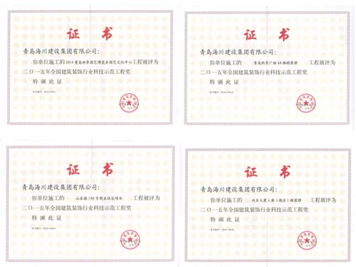 近日,海川集團(tuán)從中國(guó)建筑裝飾協(xié)會(huì)捧回4項(xiàng)全國(guó)建筑裝飾行業(yè)“科技示范工程”和4項(xiàng)“科技創(chuàng)新成果”的證書(shū)和獎(jiǎng)牌。分別為: