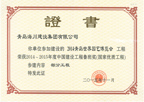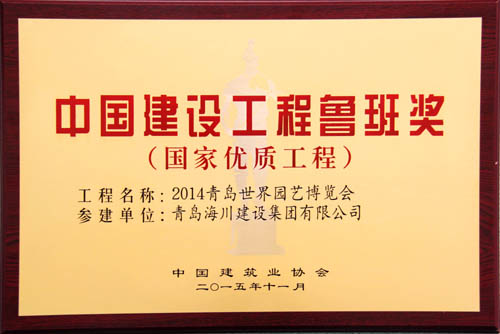 由海川集團承建的2014青島世界園藝博覽會工程榮獲2014-2015年度中國建設工程魯班獎(國家優(yōu)質(zhì)工程)。表彰大會于2015年11月16日在北京釣魚臺國賓館舉行,海川建設集團有限公司四分公司主任工程師張棟參加了會議,并捧回中國建設工程魯班獎(國家優(yōu)質(zhì)工程)獎牌及證書。