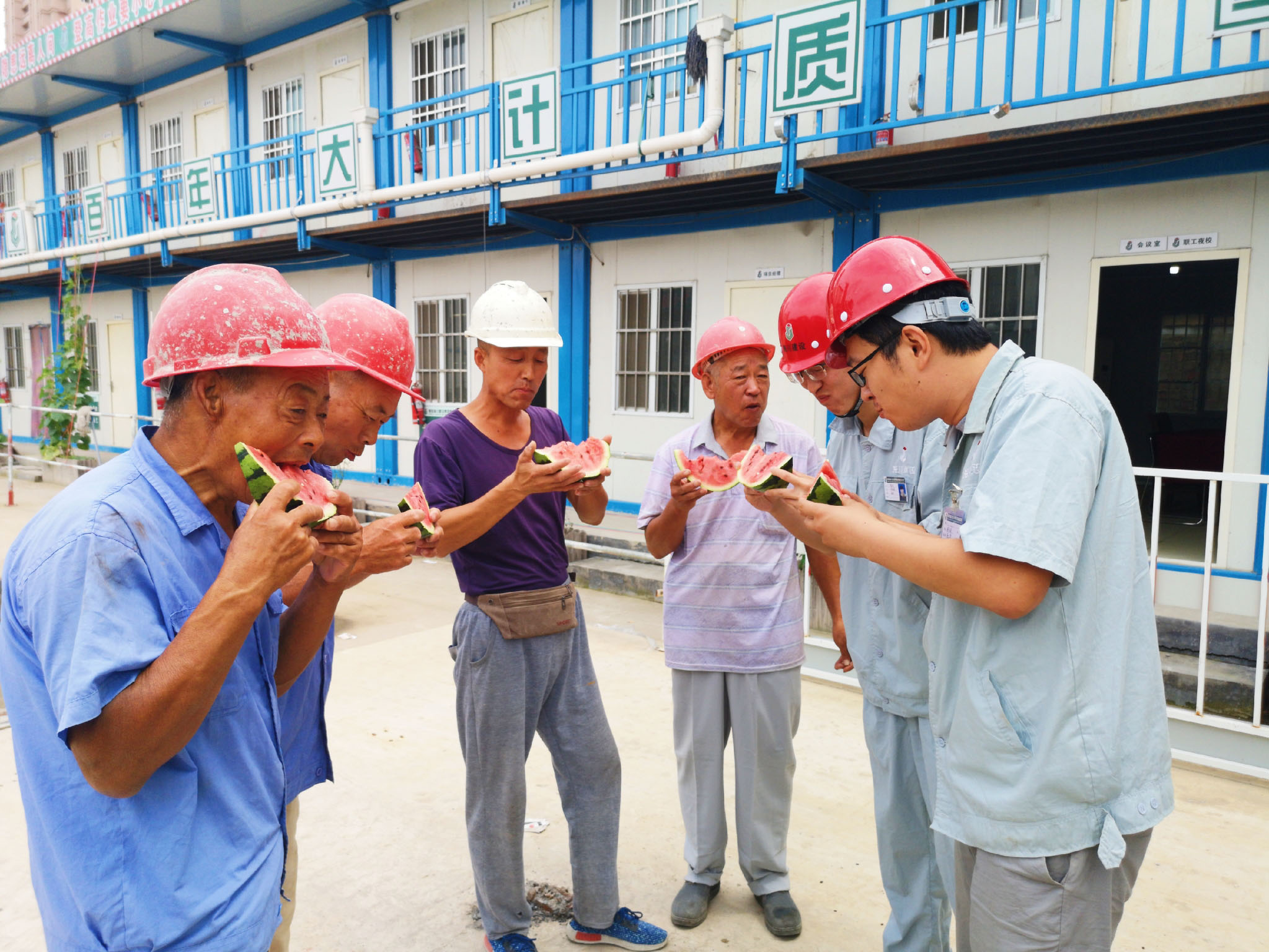 7月9日集團(tuán)工會(huì)走進(jìn)長(zhǎng)沙路人才公寓項(xiàng)目部、北澗社區(qū)安置區(qū)項(xiàng)目部、富爾瑪項(xiàng)目部、鎮(zhèn)江路12號(hào)片區(qū)項(xiàng)目部,為一線工人送去海川農(nóng)林生態(tài)園的西瓜、桃子等等解暑降溫慰問(wèn)品。
